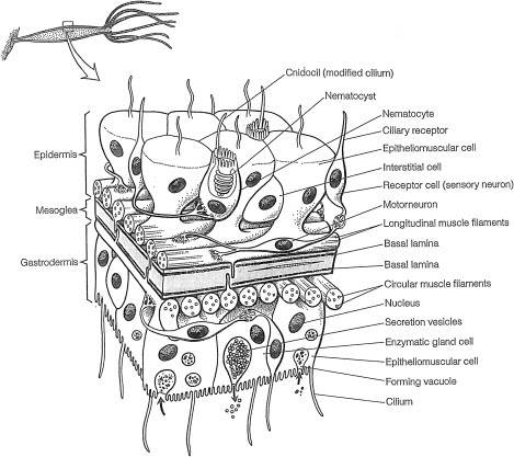 - Seu corpo é, essencialmente, constituído de uma camada externa (epidérmica) e uma interna (gastrodérmica) preenchido por uma camada gelatinosa, a mesogleia (pode ser feito um paralelo com o mesohilo das esponjas), um tecido conjuntivo